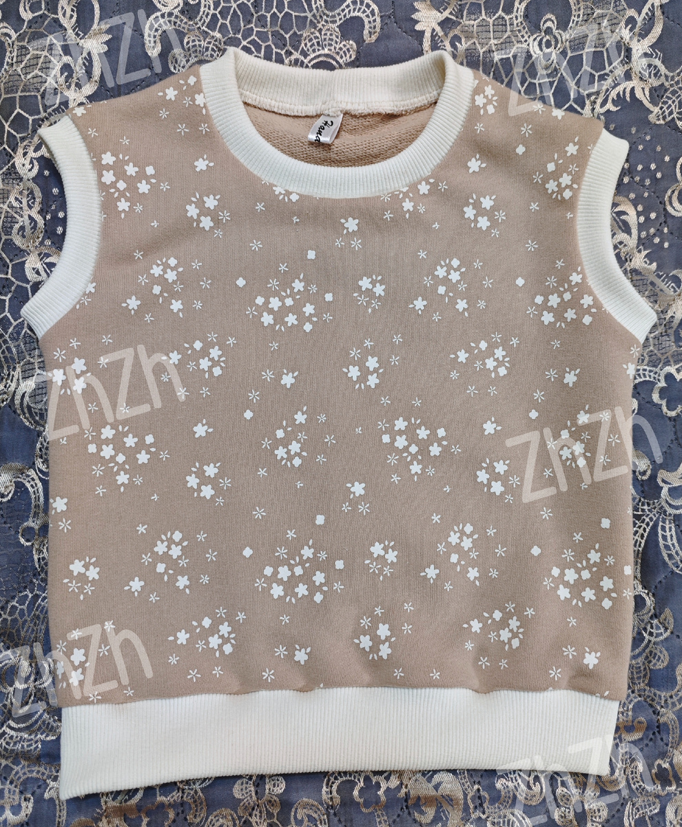 Для начала необходимо определиться с тканью. На моём примере толстая теплая ткань - футер с трехниткой. Обработать края я решила кашкорсе в цвет рисунка. Для раскроя нужно свернуть ткань лицевой стороной внутрь. А в качестве выкройки подойдёт кофта, футболка, рукава которой можно спрятать внутрь. Далее одежду сворачиваем вдоль пополам, совмещаем сгиб ткани и готовой одежды и прорисовываем контур по всем краям, не забывая добавлять припуски на швы, кроме низа - там будет обработка кашкорсе (или рибаной). Я добавляла 3 см. сбоку, чтобы жилетка была пошире, и 7 мм. по остальным краям. Спинку и перед я крою одинаково, только спереди горловину делаю глубже, отрезаю в форме полукруга ещё минимум 5 см. вниз. Далее переходим на швейную машинку, устанавливаем иголку по типу ткани, нитки по цвету. И с помощью закрытого краеобметочного шва (закрытый зигзаг) стачиваем плечевые швы. Теперь приступаем к обработке горловины. Для этого измеряем длину горловины и умножаем на коэффициент 0.8, получа