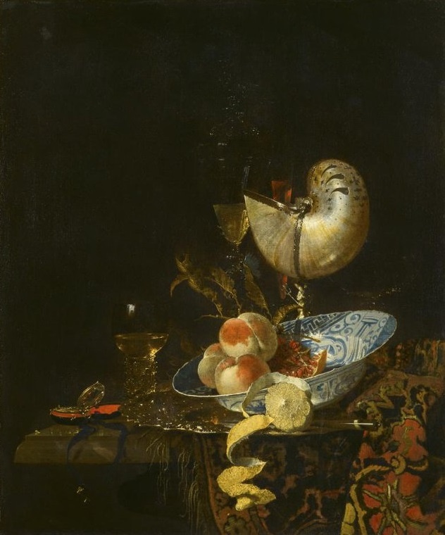 Искусство жизни Натюрморты из коллекции Пушкинского музея знакомят зрителей в первую очередь с искусством жизни. Рассказываем о том, как голландский художник Виллем Калф через богатство натюрмортов показывает быстротечность времени. Картина «Натюрморт с кубком из перламутровой раковины» принадлежит к категории так называемых роскошных натюрмортов (pronk stilleven). Благодаря расцвету международной морской торговли, главным европейским центром которой был Амстердам, в домах богатых бюргеров появлялись предметы роскоши. На натюрморте среди таких предметов — китайское фарфоровое блюдо типа краак и подлинный шедевр ювелирного искусства — кубок-наутилус, изготовленный из большой перламутровой раковины. Слева распространенный в Голландии бокал-рёмер для белого вина и пива. В центре — сосуд из венецианского стекла с фигурной крышкой, а рядом с ним высокий узкий бокал для вина, называемый флейтой. Все красивые предметы в композиции глубоко символичны: они намекают на суетность и тщетность зем