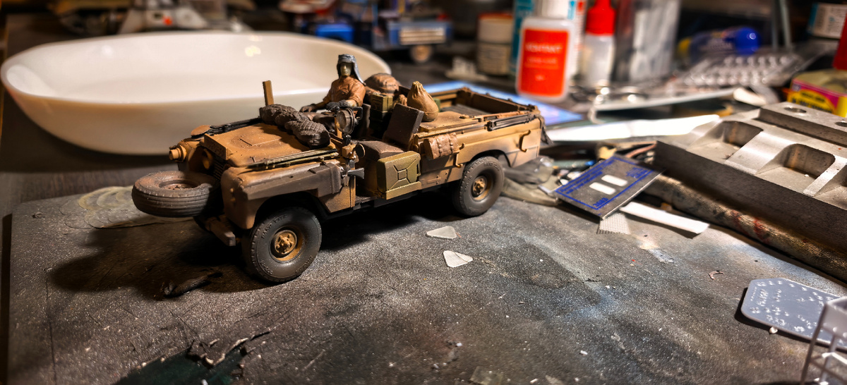 Всех приветствую! Настало время зафигалить и еще один Ленд Ровер. И тоже из древней серии. Справедливости ради надо сказать что "древняя серия" относится ко всему. Начиная от года выпуска модели (как сейчас помню 1976 год на литнике), сбори самой модели (тоже уже много лет прошло. Причем даже не 10), до момента приведения военного автомобиля в гражданский вид. Изначально это "Розовые пантеры" предназначались для использования в пустыне вовремя разведки, поэтому на машине было вооружение. В общем много на него навешивать не стал. Просто чуть оживил по цвету, окрасил фигурку водителя и в общем то все. Ну и как всегда- все допы из всей всячины оставшейся от других моделей. Про отсутствие руля знаю. Уже на месте. На фото в боксе пойдет комплектный:))