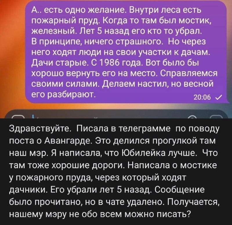 #отжителя Здравствуйте. Сегодня прочитала пост в телеграмме о прогулке нашего мэра на Авангарде.. Это скрин , который я выложила в группу, чтоб не писать 2 раза. В телеграмме я пишу, а мои смс удаляются. Мэр не обо всем хочет знать? ⚡️ Как комментировать? ⭐ Написать администратору 🏷️ Фото ретро Электросталь 📣 Доска объявлений