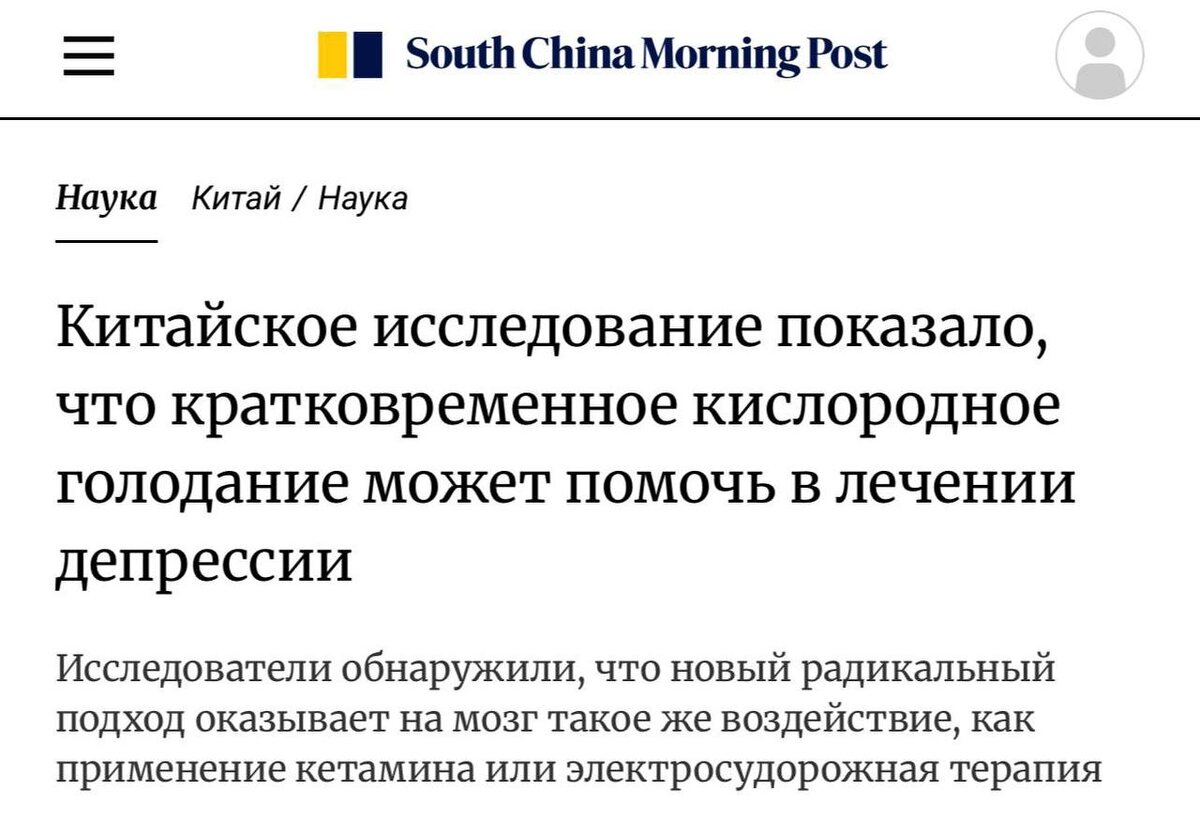 БДСМ помогает справиться с депрессией — китайские врачи выяснили, что удушье подавляет симптомы расстройства. Как оказалось, кратковременный недостаток кислорода запускает выброс аденозина — биомолекулы, которая действует как «экстренный тумблер» для угрюмого мозга, то есть природный вариант антидепрессанта. По эффекту такой метод исследователи сравнивают с методами интенсивного нейромодуляционного воздействия — теми же, что уже применяются при тяжёлых формах депрессии, хотя сами подходы остаются спорными. В экспериментальном центре Пекина метод с удушьем уже начали тестировать на группе из 30 добровольцев. Повторять в домашних условиях, на данный момент- не рекомендуется)