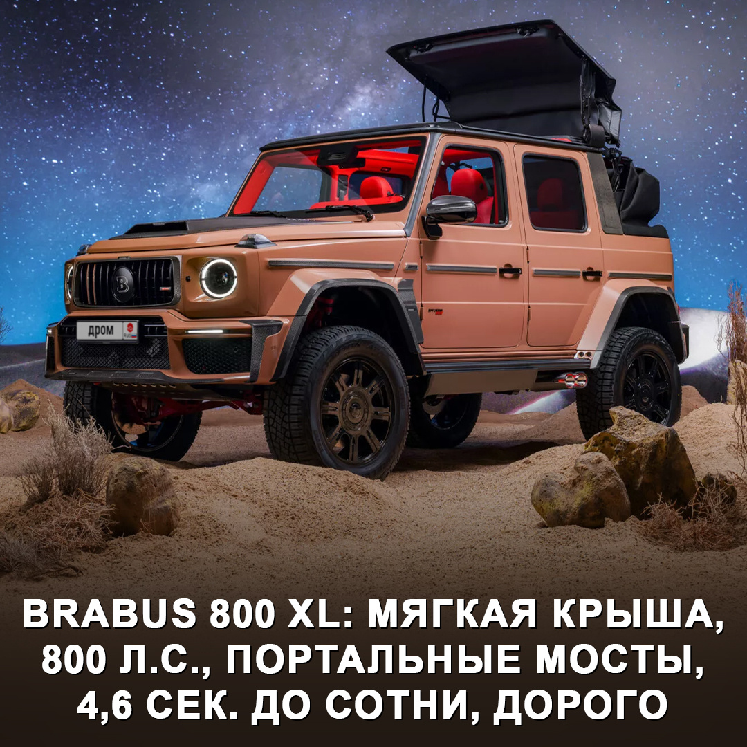 Brabus 800 XL к вашим услугам. Цена соответствующая 😎 Известные тюнеры представили своё очередное творение на базе заряженного Гелика. Новинки называются Brabus 800 и Brabus 800 XL. Что общего: → 4-литровый мотор V8 с двойным турбонаддувом на 800 л.с. (1 000 Нм), АКПП-9 и 4WD. → Складной мягкий верх с механизмом, который может собрать и разобрать крышу за 20 сек. Отмечается, что он собран из 500 изготовленных на заказ компонентов. → Усиленная рама лобового стекла и дуги из углеродного волокна для жёсткости конструкции. → Карбон и множество шильдиков Brabus в салоне. В чём разница: → Brabus 800 — спортивная подвеска, колёсные диски 24”, 4 сек. до сотни, максималка — 240 км/ч. → Brabus 800 XL — портальные мосты, 48 см под днищем, колёсные диски 22” с внедорожными шинами, 4,6 сек. до сотни, максималка — 210 км/ч. Всего соберут 50 экземпляров, цена внедорожной версии — от $1 000 000, но всё зависит от выбранных опций. Наверняка такая крыша пригодится на рыбалке около лесного озера, правда