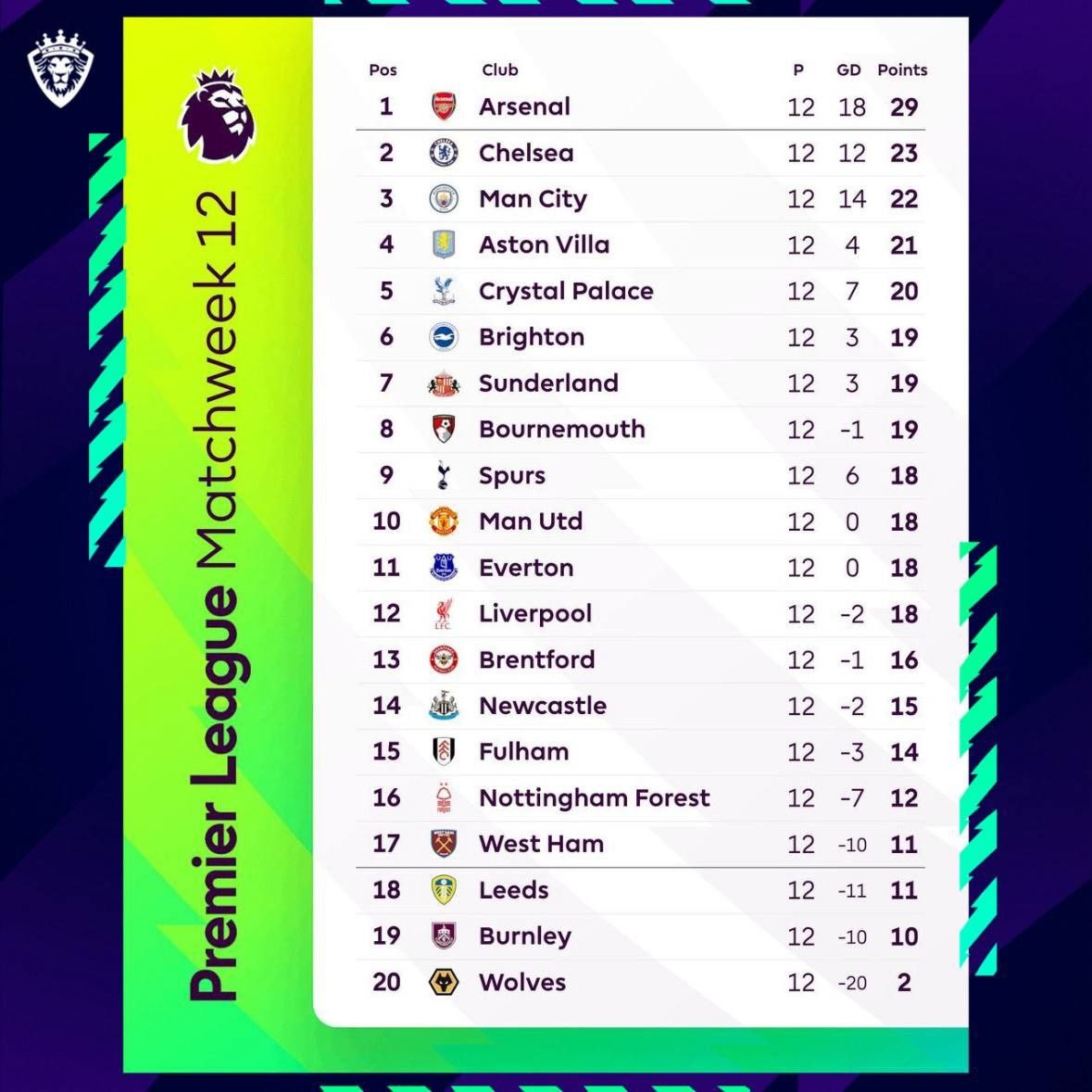 Турнирная таблица АПЛ после 12 тура