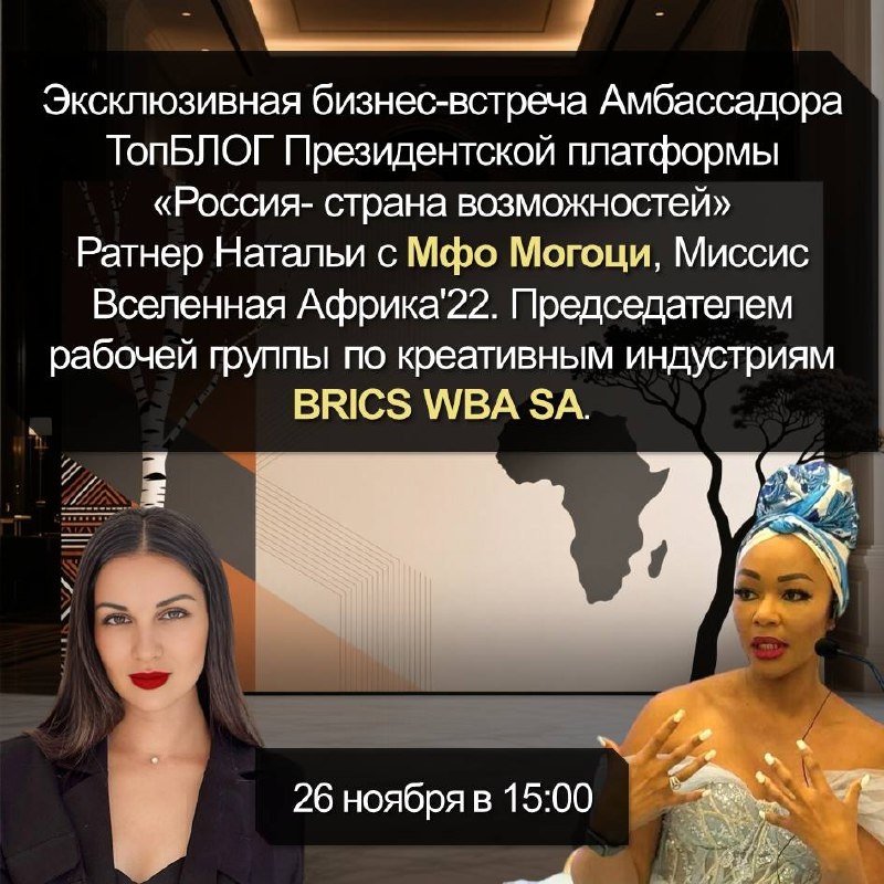 😎Вот примерно так и должна выглядеть практика в любой образовательной программе! Завершая написание дипломной работы в Президентская академия на программе: “Межпарламентские интеграционные объединения в многополярном мире”, мне выпала уникальная возможность участвовать в бизнес-встрече с директором креативных индустрий Женской деловой ассоциации БРИКС и МФО Моготси Председателем рабочей группы по креативным индустриям BRICS WBA SA в Общественной приемной по вопросам внешней торговли при уполномоченном по защите прав предпринимателей (АНО "Совет по развитию внешней торговли и международных экономических отношений"). На сегодняшний день мы уже познакомились друг с другом, и наши интересы определены с обеих сторон. Хочу отметить, что это мероприятие проводится по инициативе наших партнеров из креативной индустрии ЮАР. Мои интересы, как вы уже наверное догадались: медиа, йога и бег ☺️ Такие практические встречи помогают не только расширить горизонты знаний, но и наладить важные связи