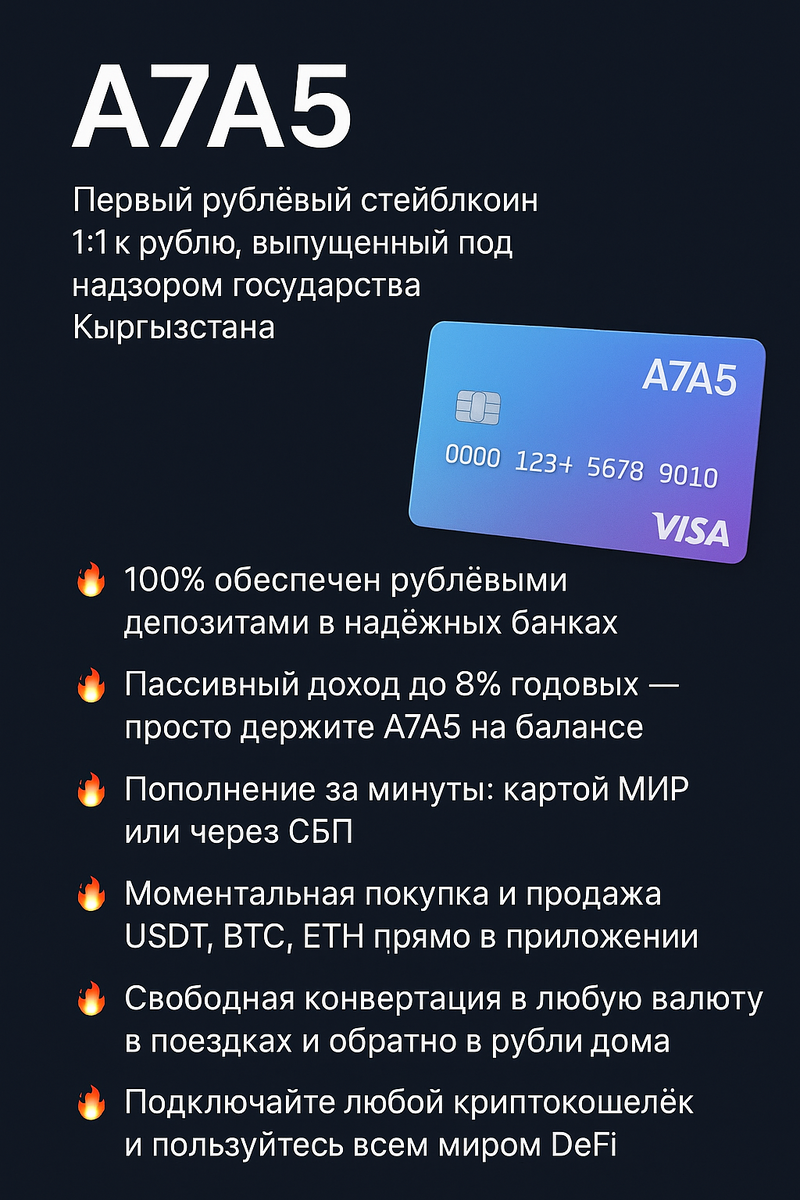Хотите оплачивать Netflix, Steam, Airbnb, AliExpress и любые зарубежные сервисы так же просто, как в российском магазине? Нужна карта, которая работает везде, где принимают Visa, но при этом полностью легальна, пополняется по СБП и картой МИР и даёт доход до 8% годовых на остаток? Тогда вам точно нужна виртуальная карта с первым в мире рублёвым стейблкоином A7A5. Что такое A7A5 и почему он лучше обычных карт и крипты A7A5 — это первый рублёвый стейблкоин, который выпущен полностью легально под контролем государства (Кыргызстан) и обеспечен реальными рублями на депозитах в надёжных банках 1:1. Это не «серый» USDT и не заблокированный банковский счёт — это цифровой рубль нового поколения, который всегда равен обычному рублю и приносит вам пассивный доход. Каждый токен A7A5, который вы держите на балансе, автоматически приносит до 8% годовых — это половина ставки овернайт крупных банков. Деньги работают, пока вы спите. Где работает виртуальная карта Visa с A7A5 Абсолютно везде, где видит