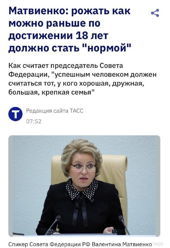 🤰В 18 лет должны рожать первенца россиянки Валентина Матвиенко предложила россиянам пересмотреть возраст материнства, заявив, что оптимальным временем для первых родов является юный возраст — примерно 18 лет. По ее словам, откладывание беременности до позднего возраста (около 28-29 лет) нежелательно и негативно влияет на здоровье будущих поколений. Матвиенко подчеркнула необходимость популяризации идеи раннего родительства среди молодежи, делая рождение детей привлекательным социальным трендом. Поддерживаем такое? 👍/👎 📲 Читайте нас в MAX 👍 Подписаться на канал