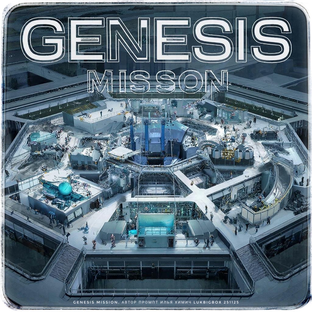 – Большой логотип Genesis Mission, стилизованный под научный символ (например, атом или молекула), который будет находиться в центре композиции.