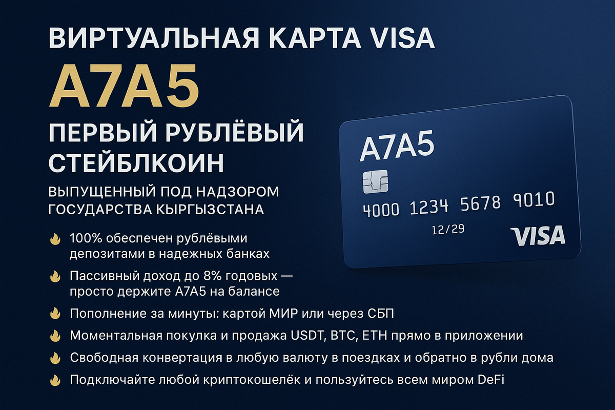 Хотите платить за границей без бешеных комиссий банков, держать деньги в стабильных рублях и при этом зарабатывать до 8% годовых просто за хранение? Теперь это реально благодаря первой в мире виртуальной карте Visa, которая работает напрямую с A7A5 — полностью регулируемым рублёвым стейблкоином. A7A5 — это первый рублёвый стейблкоин, выпущенный под строгим государственным контролем и обеспеченный на 100% рублёвыми депозитами в надёжных банках. Курс всегда 1:1 к российскому рублю. Никаких скачков, никакой волатильности. Плюс вы получаете пассивный доход: половина ставки овернайт банков автоматически начисляется держателям A7A5. На текущий момент это до 8% годовых в рублях — просто за то, что деньги лежат на балансе. Получите виртуальную карту Visa за пару минут и тратьте A7A5 везде, где принимают обычные банковские карты: Карта работает по всему миру без блокировок и ограничений. Конвертация в нужную валюту происходит автоматически по выгодному курсу — никаких скрытых комиссий 5-7%, ка