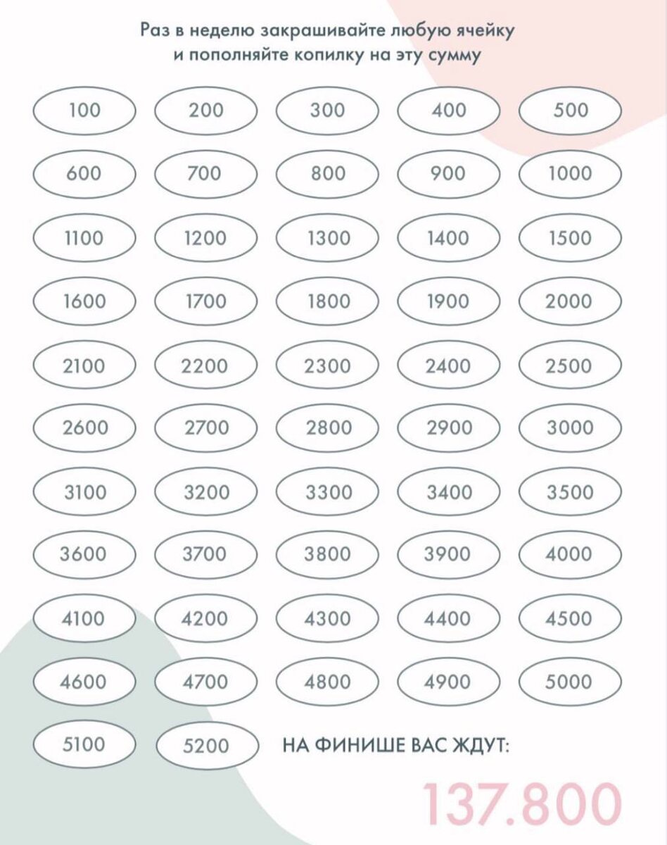 ✨ Привет, друзья! Как давно я ничего не выкладывала, и мне так хочется поделиться с вами полезной информацией! 😊 В прошлом месяце я провела финансовый интенсив, где главной темой было искусство накопления на свои цели и мечты. 💭💰 Мы работали над тем, как правильно подходить к этому процессу, и я хочу поделиться с вами некоторыми полезными приемами! 📈 В таблице 52 клетки с суммой от 100 до 5200 рублей. Вы можете использовать комфортные для вас суммы. Сформулируйте вашу финансовую цель. Я моём случае: путешествие на о. Сокотра . Каждый понедельник выбирайте приглянувшуюся (или фиксированную) сумму, закрашивайте её в табличке и переводите на свой онлайн-Кошелёк. Делитесь своими целями в комментариях, и давайте вместе двигаться к ним! 💪✨