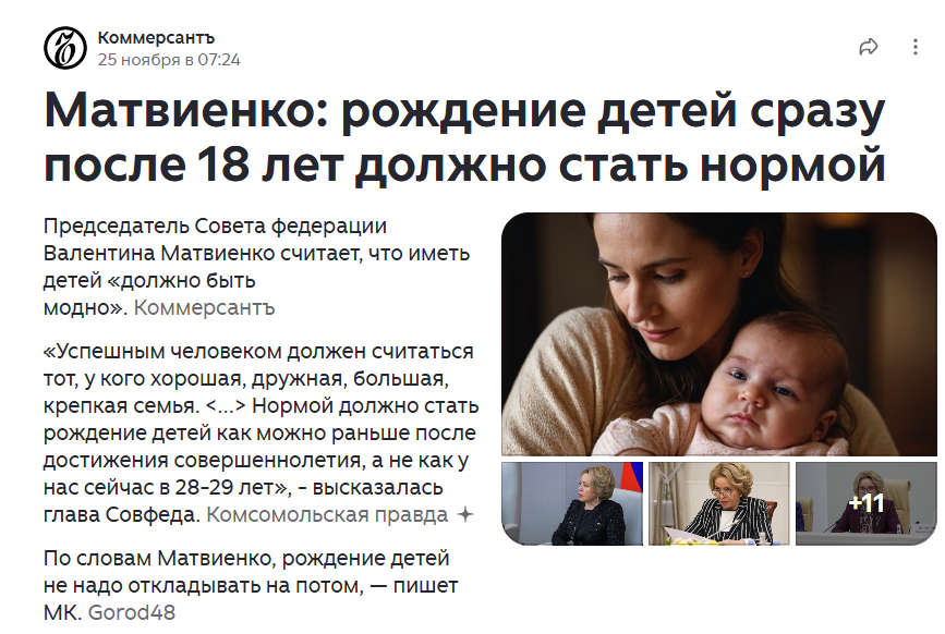 Говорит нам товарищь Матвиенко. и сразу с 18 (хм, а что, беременных школьниц уже не премируют? Деньги что ли в стране кончились?) А как же сама ? Сына (кстати - а почему только одного? А не полк ?) Родила в 24. Поздновато.. Ну ок. Может сын как то поправил демографию? Да не, тоже зря небо родины коптит и богатства ее несметные на дни рождения тратит.. Единственную дочь родил в 36. Что за безобразие? Давай Серега, рожай! не, единственный интересный факт о нем - В 2008 году С. Матвиенко отметил своё 35-летие в Юсуповском дворце, стоимость мероприятия журналисты оценили в 50—60 тыс. евро Согласно рейтингу журнала «Финанс», в 2011 году входил в список 500 российских миллиардеров (за № 486, капитал 4,9 млрд руб.) И вот так во всем...