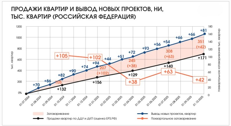 ⚡️ Рынок новостроек России обновил антирекорд: к началу IV квартала 2025 года накоплено более 350 тысяч непроданных квартир — это в 3,3 раза