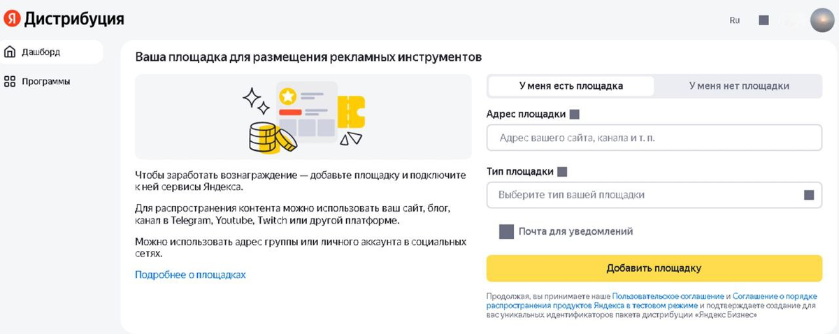 Создание новой рекламной площадки