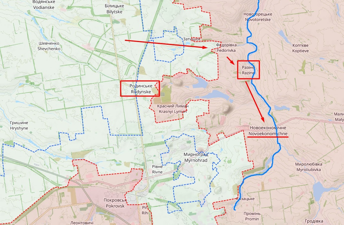 Дополнение о Мирнограде: какой был план у ВСУ и что происходит сейчас. На первой схеме примерный замысел ВСУ, который Сырский пытался реализовать на этом участке чтобы разблокировать Мирноград. Судя по всему украинская армия хотела немного севернее Родинского через Фёдоровку выйти на Разино и затем двигаться вдоль реки Казённый Торец, которая прикрывала бы левый фланг, чтобы взять или хотя бы навязать бои за Новоэкономическое. ВС РФ при успехе не смогли бы удерживать Родинское и Красный лиман, снабжение Мирнограда было бы разблокировано. Реализация замысла началась во второй половине октября и достигла некоторого успеха, как минимум ВСУ фиксировались в районе Суворова\Затышка. Однако затем наступление захлебнулось, весь последний месяц оттуда не было никакой новой информации, а вчера появилось видео с привязкой чуть севернее Затышка: на видео высаживается десант ВС РФ и попадает под огонь украинской артиллерии. То есть мы понимаем, что это серая зона, в которой уже российская арми