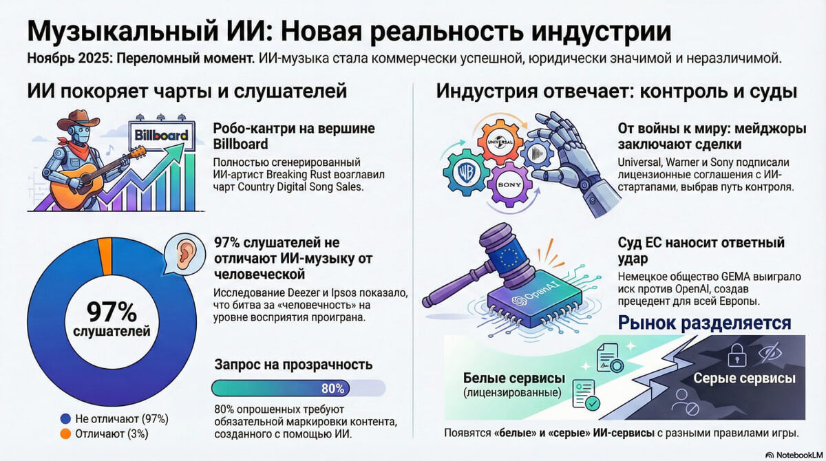 Ноябрь стал месяцем, когда гипотезы превратились в факты, а абстрактные угрозы — в заголовки чартов. Если октябрь был месяцем переговоров, то ноябрь — время подписания контрактов и подсчёта ошеломляющих результатов. Индустрия больше не спрашивает «что, если?», она столкнулась с реальностью: ИИ-музыка коммерчески успешна, неотличима от человеческой для большинства, и теперь её нужно как-то регулировать.