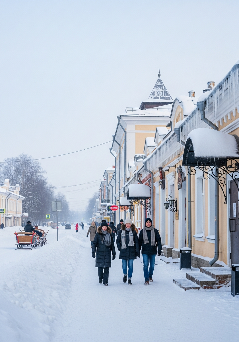 Самая высокая пожарная башня в России возвышается почти на полсотни метров. Зимой красный кирпич каланчи эффектно выделяется на фоне снежного неба — настоящая вертикальная доминанта города.