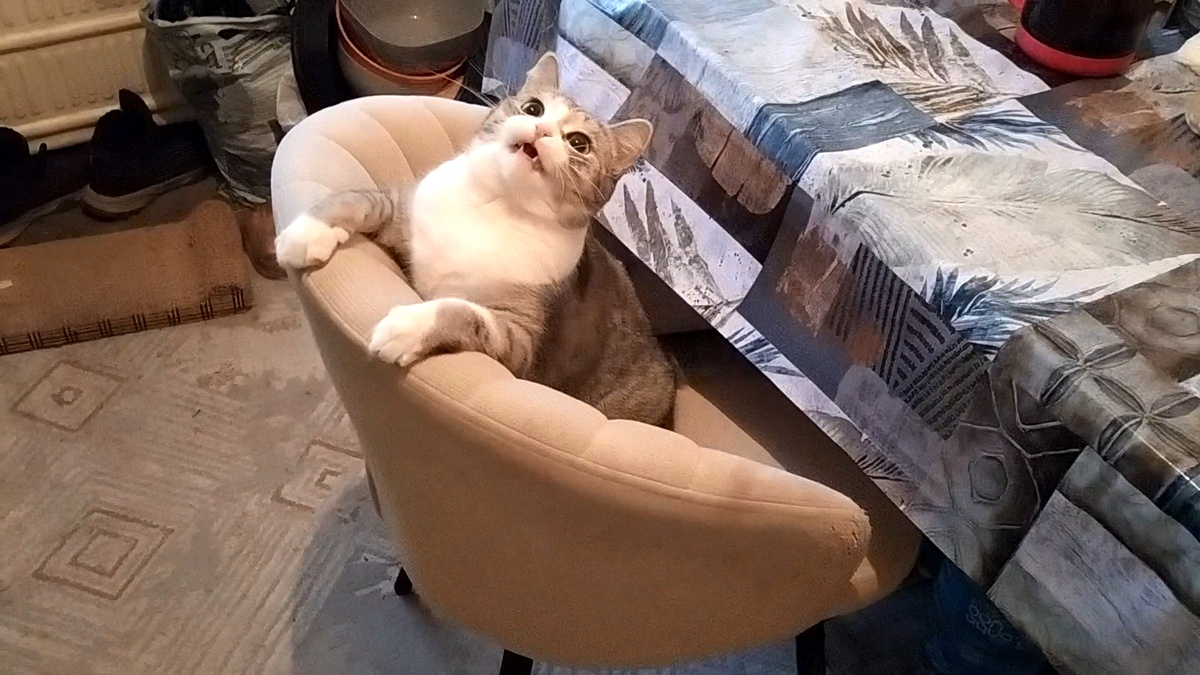 Наступила эпоха минимализма - Тигруня с новой веревочкой уже не прыгает по полу, а просит играть с ней в уютном кресле. И не устанешь и удобно. Маши себе когтями, да требуй от хозяина накидывать. Этак скоро и с этим шнурочком начнет лежа играть. Ссылка на видео в ОК: