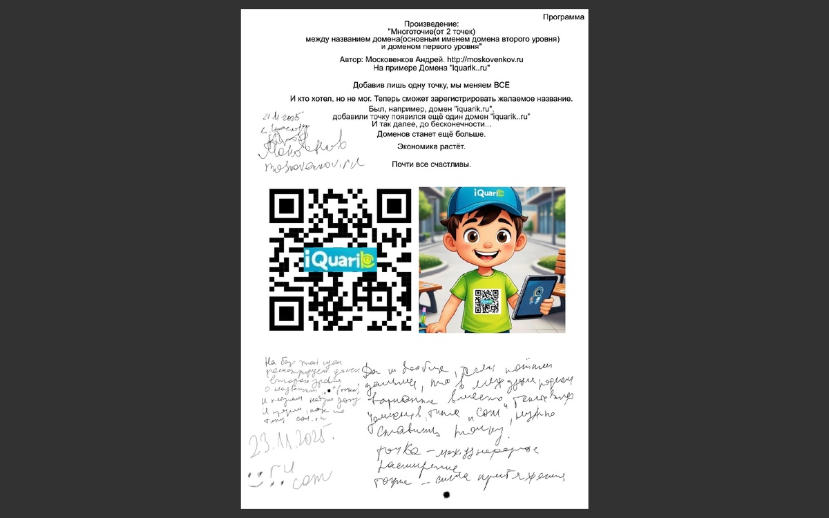 Многоточие… Многоточие… — программа применения и расширения уровня доменных зон. «Многоточие(от 2 точек) между названием домена(основным именем домена второго уровня) и доменом первого уровня» Подробнее в файле. точка-точка-многоточие-в-доменах-пример_точка-как-международный-домен-первого-уровняСкачать Знакомьтесь, Проект iquarik.ru-Социальное Закюаривание© Инновационный социальный проект. Автор Московенков Андрей. moskovenkov.ru деньпритяжения.рф Виртуальная выставка «ДЕТСТВО» https://xn--b1add1bnfb.xn--p1ai/многоточие/