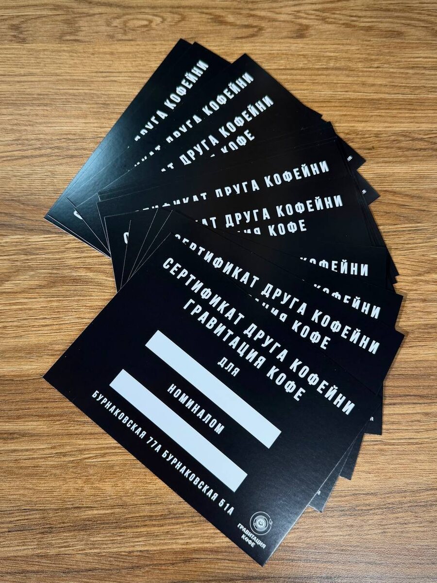 новая крутая акция до конца года у нас можно приобрести сертификаты на следующий год в подарок или для себя номинал больше цены, есть следующие комбинации: Цена: 1000 Номинал: 1100 Цена: 5000 Номинал: 5600 Цена: 10000 Номинал: 11400 Цена: 20000 Номинал: 23000 сертификат можно будет использовать самостоятельно или перевести в бонусные баллы за сертификат можно брать напитки, десерты, еду, зерновой кофе и дрипы (!) для вас это возможность получить на всё скидку до 15% и поддержать нашу сеть, пока у нас адекватная система налогообложения уже можно приобрести в полноформатной кофейне по адресу Бурнаковская 77А