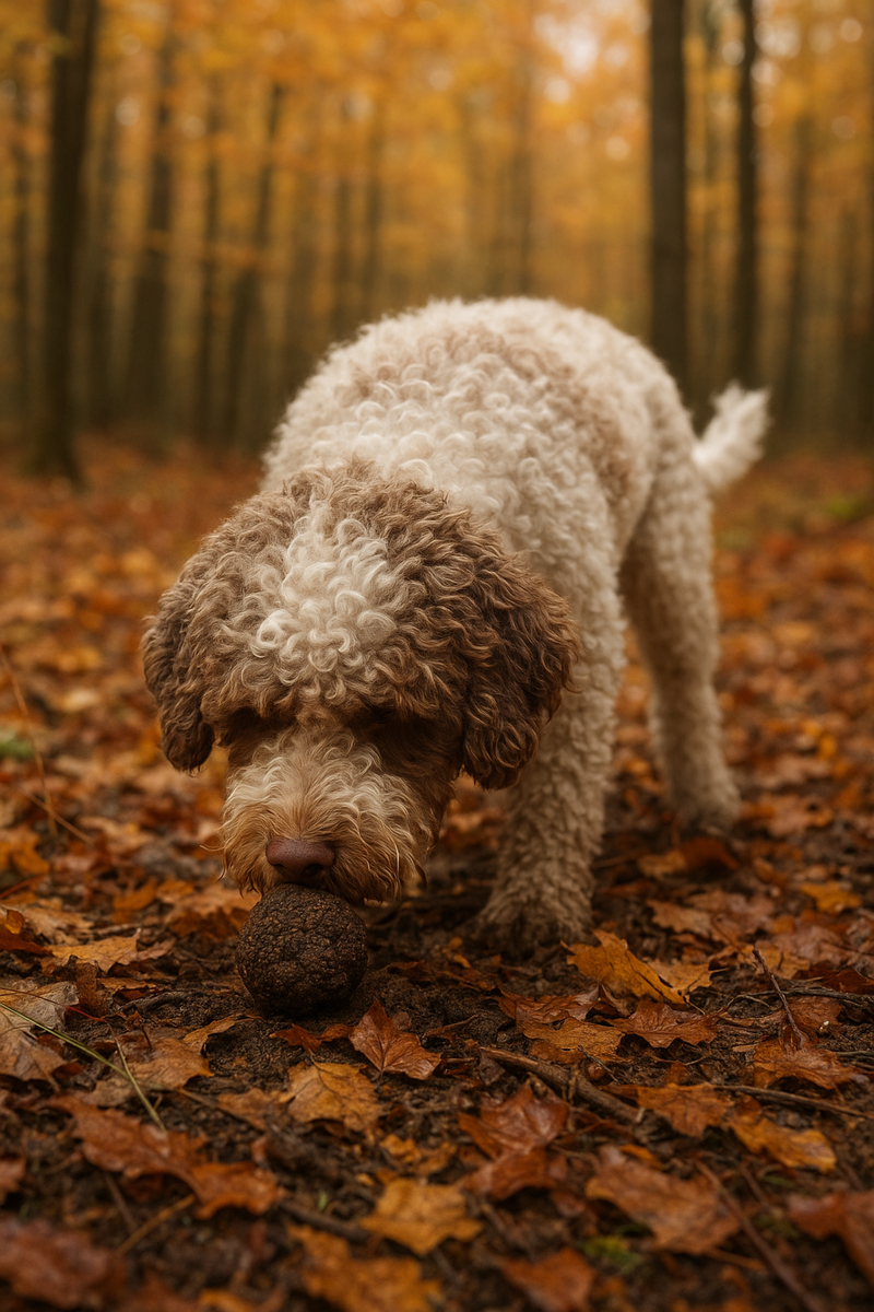 Однажды у нас на занятиях был чудесный бульдог по имени Трюфель — обаятельный, упрямый и совершенно не предназначенный для поиска грибов (разве что печеночных). Но сегодня не о нём. Речь о тех собаках, которые действительно ищут трюфель — и делают это так, что никакой «свинье-специалисту» не угнаться. Поиск трюфелей — это отдельное, изысканное направление собачьей работы, где сочетаются тонкий нюх, усидчивость и чутьё на успех. Этим занимаются в Италии, Франции, Испании, Хорватии, а в последние годы — и в России. В Пьемонте, например, собаки выходят на «охоту» за белым трюфелем почти как ювелиры — тихо, без спешки, с уважением к земле. Традиционно лучшими трюфельными собаками считаются лаготто романьоло — старинная итальянская водяная порода, чей кудрявый нос знает толк в ароматах. Но отлично справляются и спаниели, и пудели, и даже метисы, если у них есть страсть к поиску и вкус к работе. Самое интересное, что трюфельные собаки учатся не просто находить запах гриба — они учатся