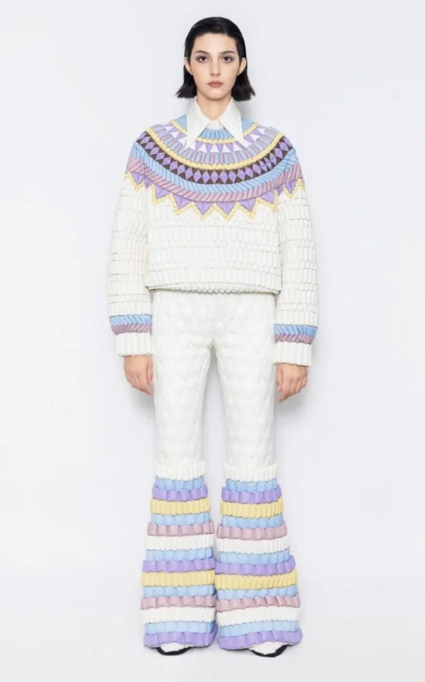 И, нет. Это не стежка. Хотя именно эта мысль приходит первой и преследует до первого крупного фото, где видно, насколько изящно, креативно и невероятно просто создан такой декор Впрочем, называть это декором вряд ли правильно, хотя некоторые модели вполне соответствуют этому термину Например, эта издалека вообще похожа на вязаный костюм Или эта Или эта Или эта Другие навевают мысли о пэчворке, когда шьются маленькие подушечки, набиваются синтепоном и соединяются в полотно А какая роскошная посадка у брюк! На это можно смотреть бесконечно! А как вам такая игра рисунка? Не забудьте открыть в полный размер, чтобы впечатлиться! Не знаю, почему, но всегда испытываю особый трепет, когда образы полные, включая сумочки, шапочки и даже обувь И даже палантин Наиболее эффектно технология смотрится на монохромных комплектах Даже черный, который считается слепым для фото, выглядит весьма эффектно Именно рельеф и объем обеспечивают игру света и тени, придавая особую глубину и рельеф На светлых отте