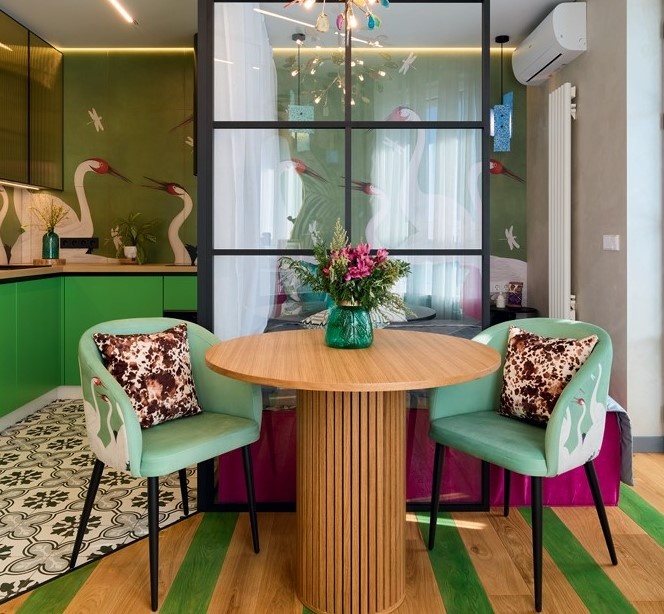 Преобразить небольшую студию в Петербурге так, чтобы она напоминала тропики – задача смелая и почти авантюрная. Здесь важно не перегрузить пространство, сохранить лёгкость и при этом передать настроение вечнозеленого лета. Как дизайнеру Ирине Агафоновой удалось собрать все эти элементы в гармоничную и яркую историю – читайте в нашей статье. Когда за окном питерская серость, так хочется ярких красок! Именно такая задача стояла перед дизайнером в этой студии, где главной особенностью интерьера стал зелёный цвет, обыгранный в разных оттенках и фактурах. В прихожей внимание сразу привлекает большое художественное панно с девушкой, а напротив – консоль с похожей росписью. Декоративные рейки и два аккуратных подвесных светильника завершают картину. Главная проблема многих студий – как отделить спальню от гостиной и кухни. Здесь решение и простое, и интересное одновременно: стеклянная перегородка. Она физически разделяет зоны, но пропускает свет и воздух. Все стены в квартире отделаны деко