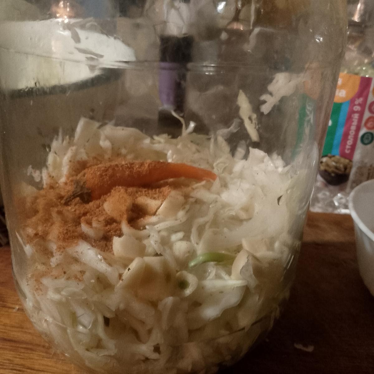 Не хочу до завтра ждать, пишу статью вечером. У кого-то по корейски морковка, а у меня капуста. Что-то можно в любое время года делать, типа, как я сегодня. Захотелось салат из капусты. Мы капусту в любом виде любим. Я и решила сделать салат в банке, который придумала на ходу из того, что было. У меня в холодильник не умещается 3 литровая банка и делаю 2 литра капусты. Мну капусту руками, конечно, резанную уже, а не кочан и кладу в банку. Сначала добавила острый перец. Он маленький, но острый как большой. Вовремя увидела, что приправа острая. Попробовала и согласилась. Не обманули, перчик убрала. Чеснок. Соль, лавровый лист, сахар, масло у меня горчичное, соевый соус, уксус. Потом подумала и решила лук красный добавить. На заднем плане банка с горьким перцем. Тоже делала недавно. Не хуже покупного получился. С капустой его помяла, но не весь. На пробу оставила, как будет лучше так и буду делать. У меня два больших слоя и последний с луком и капустой. Пересыпала и добавляла по-вкус