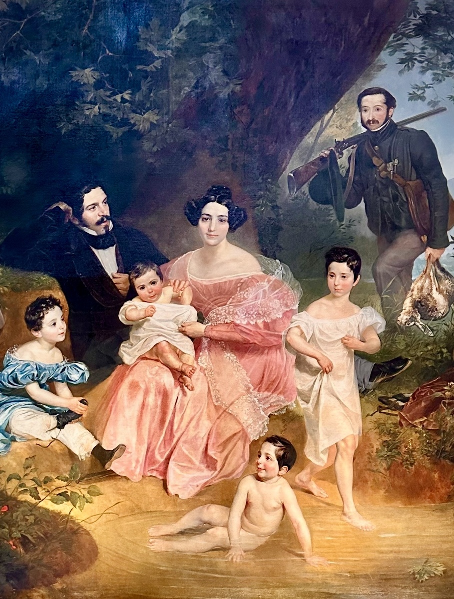 Самым главным событием выставки «В зеркале судьбы» стало представление широкой публике никогда ранее не экспонировавшейся работы Карла Павловича Брюллова – «Портрет семьи Мариетти». Безусловно, мало кому известная работа «Великого Карла» итальянского периода, для представления которой полностью отдали огромный Георгиевский зал Михайловского замка, заслуживает всяческого внимания. Но семейный портрет на выставке конечно представлен значительно шире и другие работы не менее интересны. Да и фамилии таких мастеров как Аргунов, Боровиковский, Доу, Монье… говорят сами за себя. Впрочем, тут наверное важнее даже не мастерство живописцев, а судьбы людей, которые изображены на этих очень сентиментальных полотнах. Допустим самой любопытной, лично для меня, стала совсем небольшая работа вообще исполненная не слишком одаренным любителем. Это портрет семейства придворного метрдотеля вдовствующие императрицы Марии Федоровны Луи Жюля Сезара Бенуа авторства «какого-то друга дома по фамилии
