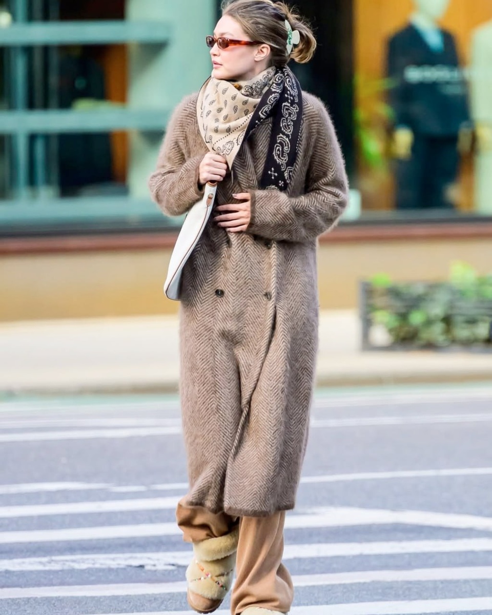 Образ в стиле Джиджи Хадид Знакомим с идеальной формулой зимнего стиля в духе Джиджи. Окунитесь в современный городской комфорт пронизанный в каждой детали: теплое пальто, прямые брюки и практичные угги — создают незаменимую базу, на которую легко опираться каждый день в холодный сезон. А трендовые акцентные аксессуары в виде заколки, очков, сумки и платка — формируют тот самый расслабленный chic, который так любит модель. 1. Пальто Luisa- Spagnoli 2. Брюки Mandelli 3. Шарф Twinset Milano 4. Заколка Disetta 5. Угги Inuikii 6. Очки Toteme 7. Сумка Miu Miu