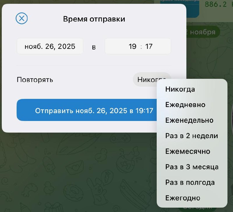 Видели, какое классное обновление в ТГ? В Телеграме есть шикарная функция — отложенное сообщение. Написал сегодня, а отправил когда угодно. А теперь добавили обновление — можно ставить сообщение на повтор. Удобная история для всех, кто любит автоматизации. Щепотка автоматизации в ТГ. Пробуйте, работает.