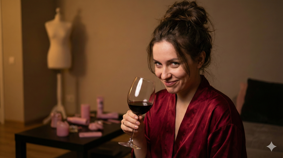 Алина убрала со стола вазу с искусственными пионами. На её место она водрузила... Изделие. Гигантское. Цвета «бешеная фуксия». Оно гордо возвышалось посередине стола, как маяк надежды. Рядом живописно валялись шарики на сцепке и флаконы со смазкой, названия которых звучали как призыв к дьяволу.
