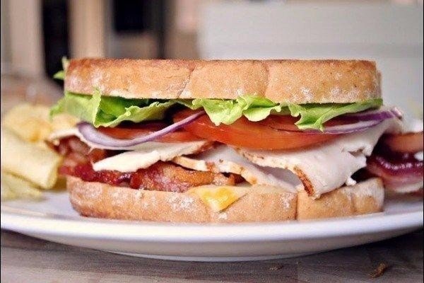 Количество сэндвичей: 4 шт. Ингредиенты: Бекон (заранее приготовленный) — 400 г Хлеб – 8 ломтиков Помидоры – 8 ломтиков Мясо – 8 ломтиков Сыр – 4 ломтика Салат – 4 листика Красный лук Майонез Количество сандвичей — 4 шт. Приготовление: 1. На сковороде поджариваем ломтики хлеба с одной стороны. 2. На неподжаренную сторону мажем майонез. 3. Сверху кладём сыр и бекон, затем мясо. 4. Затем два ломтика помидоров, нарезанный лук, листья салата. 5. Накрываем вторым кусочком хлеба. Сэндвич готов!
