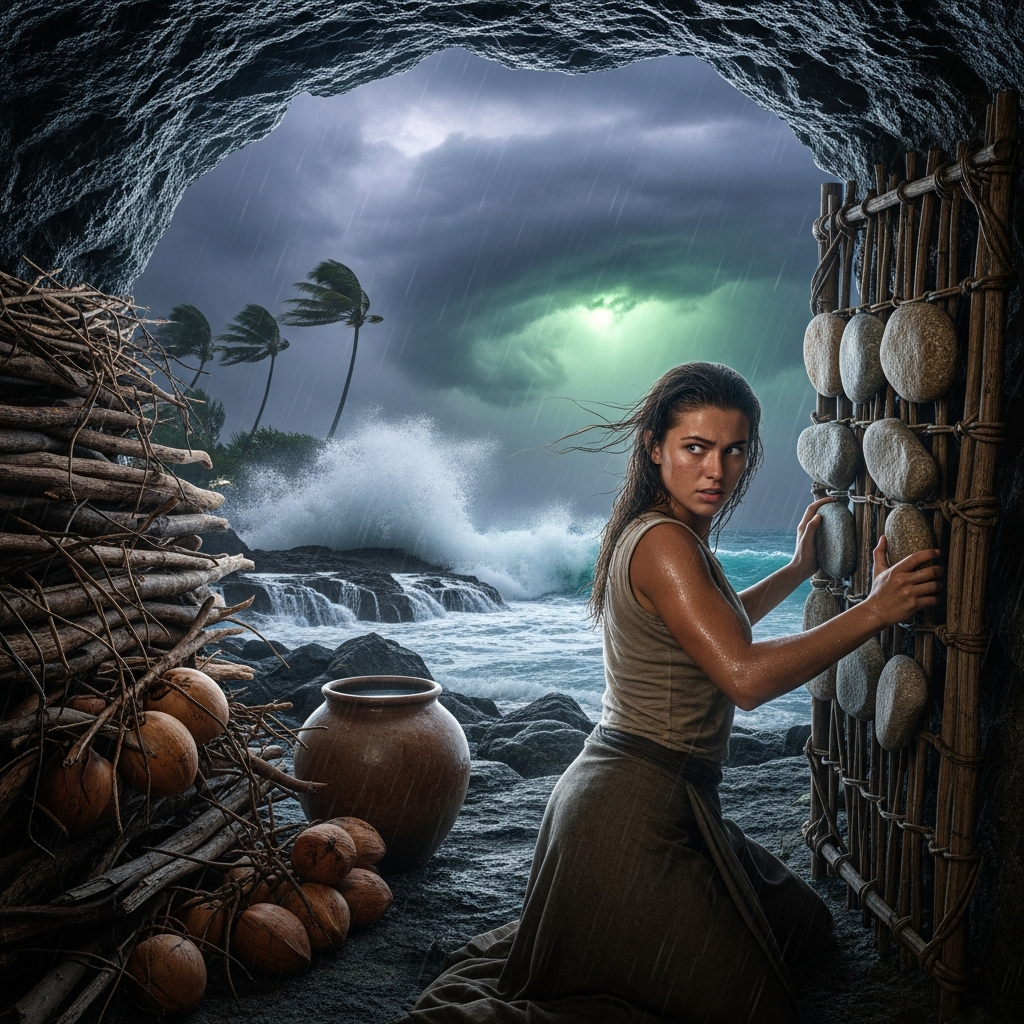 Она торопилась: укрепила плетеную дверь в пещеру дополнительными камнями, натаскала внутрь сухих дров и кокосов, запасла воды в своем глиняном горшке. Сердце колотилось не от страха, а от мрачного предчувствия. Этот шторм чувствовался иначе. Он нес с собой не просто дождь и ветер, а перемены.