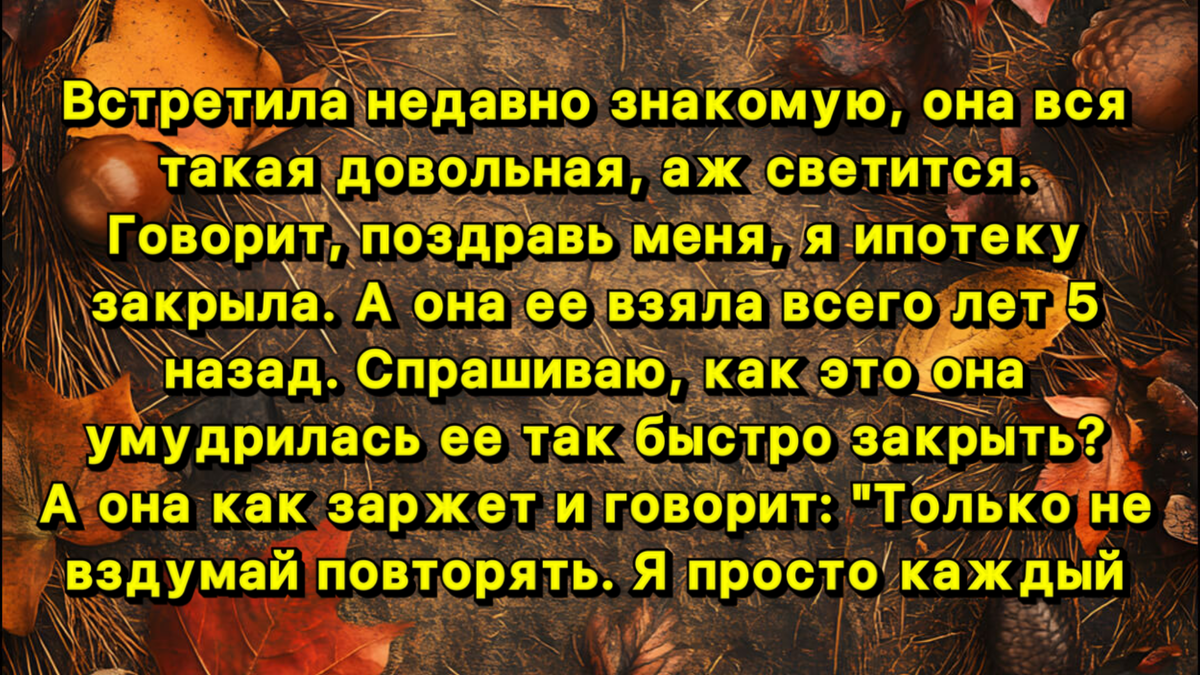 Знакомая героини закрыла ипотеку за 5 лет, сохраняя 85% зарплаты. Ее секрет был прост: она превратила свою жизнь в ад, превратившись в социального паразита. Мылась у друзей, ела у родственников, стирала и заряжала телефон на работе. Героиня справедливо заключила, что такая «победа» над банком больше похожа на поражение в человеческих отношениях.