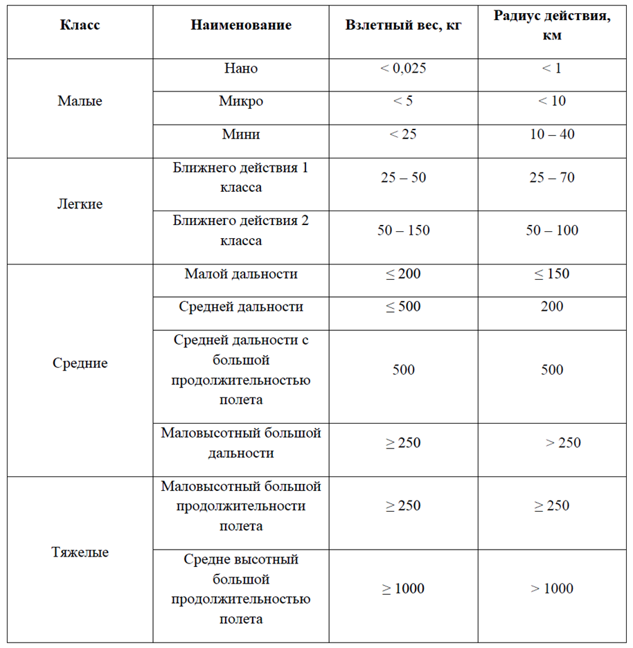 В этих же рекомендациях даётся классификация, «рекомендованная Министерством обороны Российской Федерации». И в ней мы обнаруживаем, что взлётный вес аппаратов, которые преодолевают 500 км оказывается свыше 500 кг.