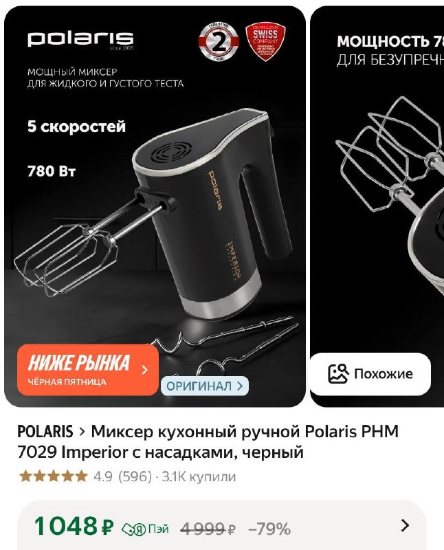 Миксер кухонный ручной Polaris PHM 7029 Imperior с насадками, черный
