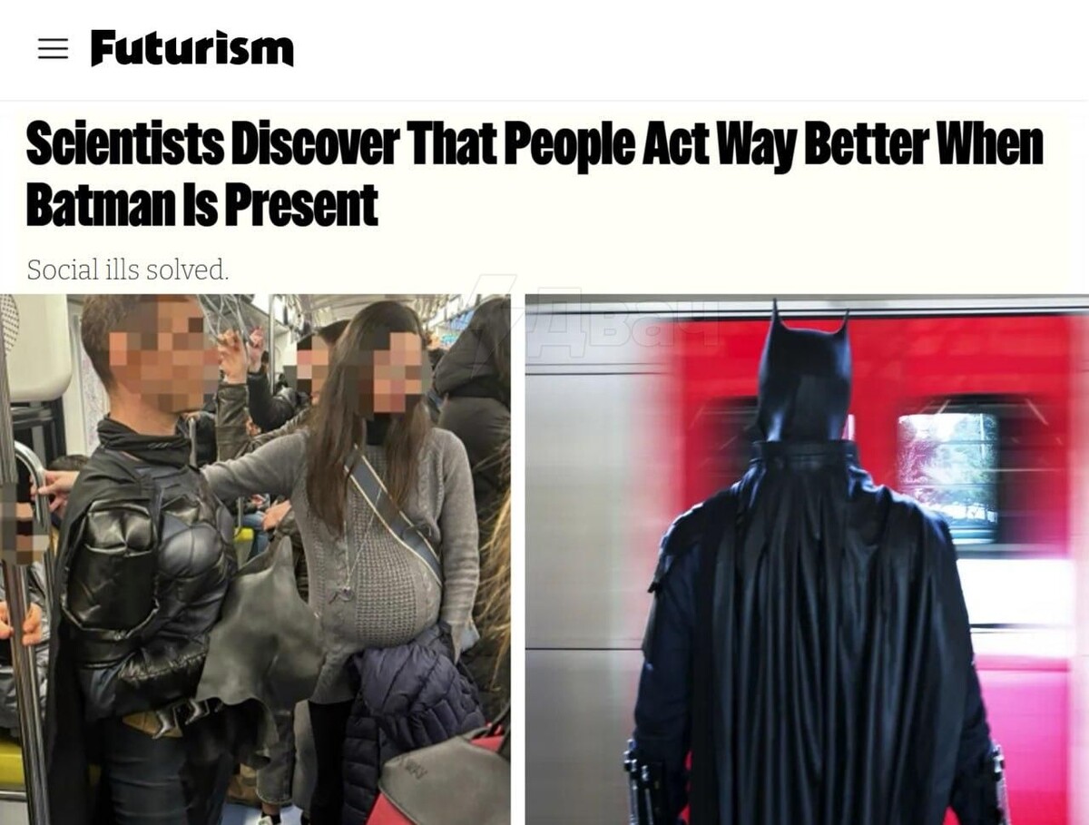 В метро Милана провели эксперимент: в вагоне появился человек в костюме Бэтмена. Результат — рост вежливости пассажиров. Без костюмированного героя место уступали 37,6% людей, с ним — уже 67,2%. Эффект объяснили так: присутствие символа героизма мотивирует вести себя лучше.