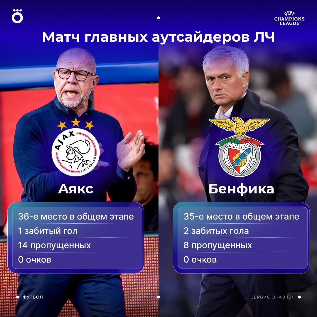 У «Аякса» и «Бенфики» все ужасно в ЛЧ. По-прежнему 0 очков после 4 туров 😬 В 20:45 аутсайдеры общего этапа встретятся в очном матче. Как закончится игра в Амстердаме? ❤️ — «Аякс» победит 🔥 — «Бенфика» победит 🤝 — ничья