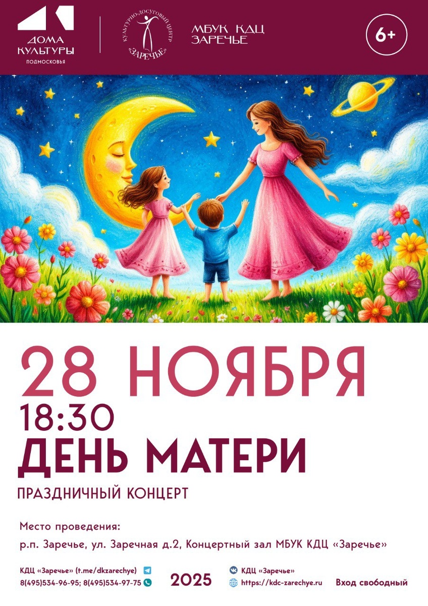 В эту пятницу, 28 ноября, приглашаем вас на КОНЦЕРТ, посвященный теплому празднику, который отмечается в нашей стране в конце последнего осеннего месяца - ДНЮ МАТЕРИ! ❤ На концерте вы услышите самые душевные и нежные песни и стихи, увидите красивые танцы, посвященные самому близкому человеку – маме. 💃🎶 Начало в 18:30 #кдцзаречье #культура_одинцовскийгородскойокруг #культуравзаречье #культура #ОГО #культураОГО #ДеньМатери #концерт
