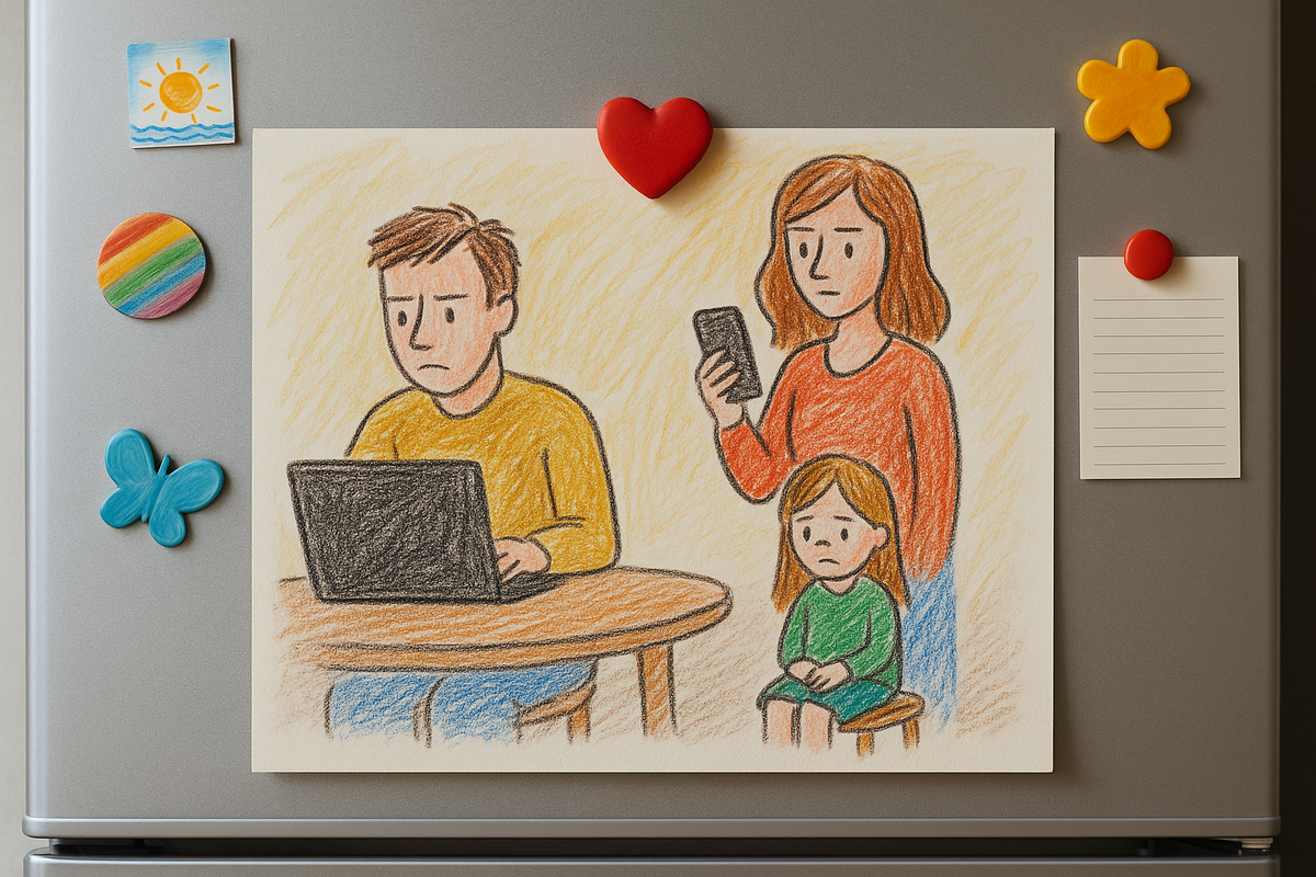 Но каждый раз, проходя мимо холодильника, они видели тот самый рисунок: папа за ноутбуком, мама с телефоном, девочка в уголке. И подпись, написанную неровным детским почерком: «Моя семья. Они всегда заняты».