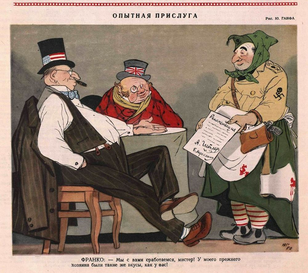 1950. Юлий Ганф (1898—1973). «Опытная прислуга. Франко: — Мы с вами сработаемся, мистер! У моего прежнего хозяина были такие же вкусы, как у вас!» (Показывает рекомендацию с подписями дуче и фюрера)