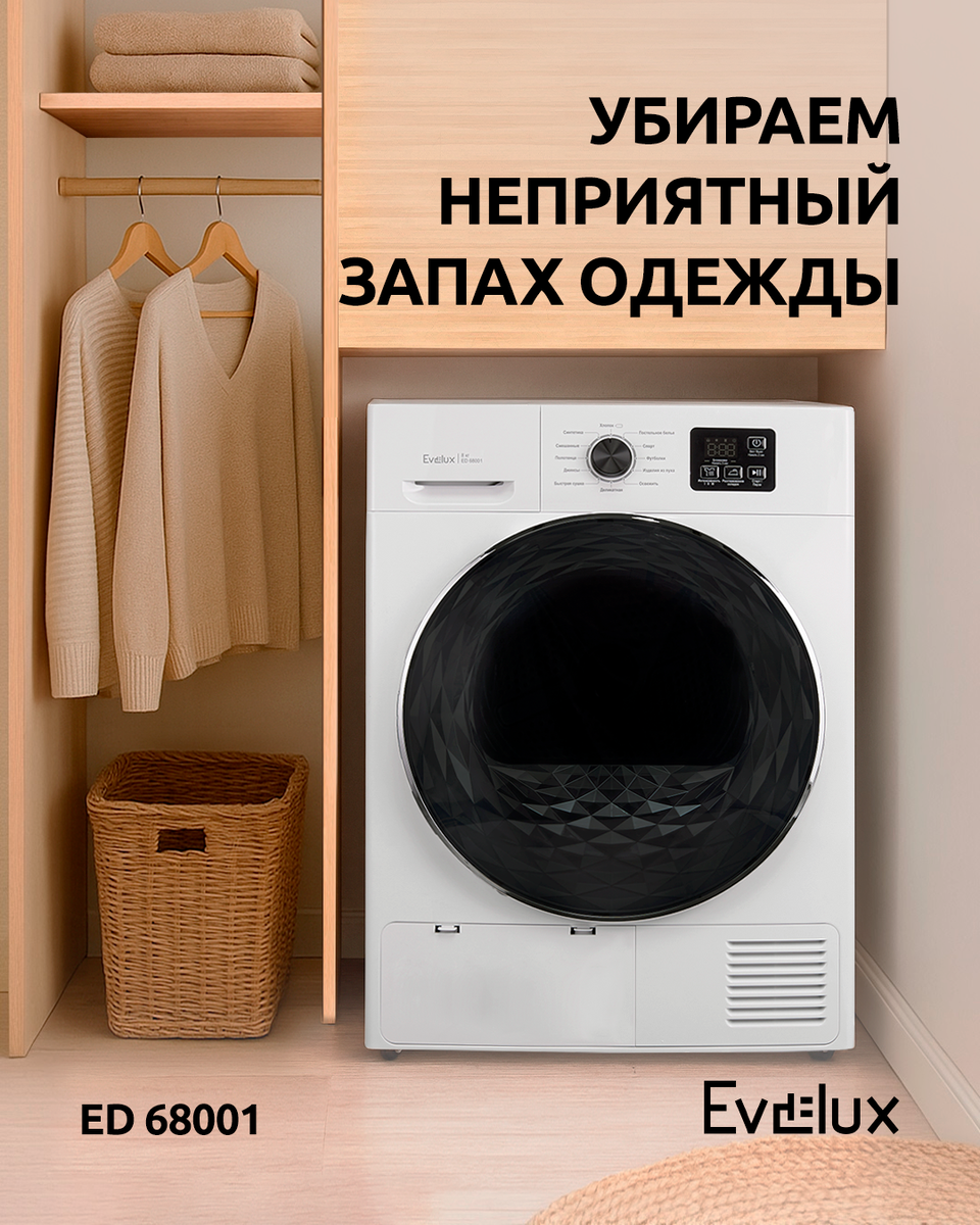 Со временем вещи в гардеробе могут потерять свежесть — будь то из-за сырости, длительного хранения или редкого использования. Вернуть одежде ощущение свежести вы можете с помощью простых решений: 🔸 Режим «Освежить» в сушильной машине Evelux ED 68001 — удалит лёгкие запахи и лишнюю влагу. 🔸 Саше с углём или содой — впитают влагу и неприятные запахи. 🔸 Вешалки с кедровыми вставками — нейтрализуют запах, отпугнут моль и впитают лишнюю влагу. 🔸 Антибактериальные спреи для тканей — удалят запах и предотвратят появление плесени. 🔸 Чехлы для сезонной одежды из хлопка или льна — защитят вещи от пыли и конденсата. Подробнее о сушильной машине Evelux ED 68001 вы можете узнать по ссылке: https://clck.ru/3QPnDL