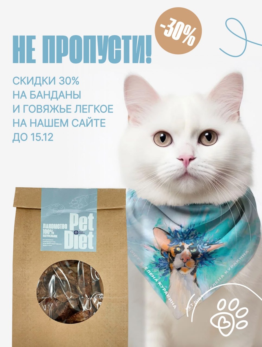 Любите баловать своего питомца стильными аксессуарами и натуральными вкусняшками? Тогда у нас классная новость! 😻 Только до 15 декабря на нашем сайте - скидка 30% на крутые банданы с авторским дизайном и на говяжье легкое 🔥 Количество бандан и легкого ограничено, успейте заказать, пока не разобрали ☺️ Как заказать? Переходим на сайт: https://pet-diet.ru/ 👉 Чтобы заказать Бандану: переходите в меню "Для кошек и котят" -> "Аксессуары". 👉 Чтобы заказать Говяжье легкое: переходите в меню "Лакомства".