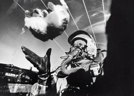 πΠΠΊΡΠΏΠ΅ΡΠΈΠΌΠ΅Π½ΡΡ Ρ ΠΊΠΎΡΠΊΠ°ΠΌΠΈ Π² Π½Π΅Π²Π΅ΡΠΎΠΌΠΎΡΡΠΈ, ΠΏΡΠΎΠ²ΠΎΠ΄ΠΈΠΌΡΠ΅ Π² ΠΊΠ°Π±ΠΈΠ½Π΅ ΠΈΡΡΡΠ΅Π±ΠΈΡΠ΅Π»Π΅ΠΉ F-94 Starfire Π΄Π»Ρ ΠΈΠ·ΡΡΠ΅Π½ΠΈΡ Π²Π»ΠΈΡΠ½ΠΈΡ ΡΡΠ»ΠΎΠ²ΠΈΠΉ ΠΌΠΈΠΊΡΠΎΠ³ΡΠ°Π²ΠΈΡΠ°ΡΠΈΠΈ, 1958