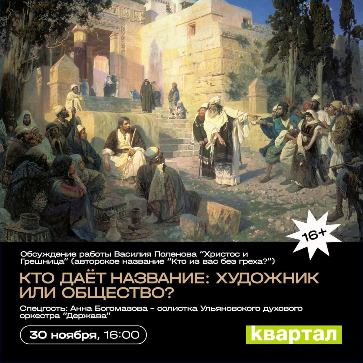 Обсуждение картины Василия Поленова “Христос и Грешница” (авторское название “Кто из вас без греха?” 🗓️ 30 ноября, 16.00 📍Квартал, Ленина 78 Василий Дмитриевич Поленов — русский живописец, один из наиболее значимых художников пореформенной эпохи, педагог; мастер исторической, пейзажной и жанровой картины, новатор техники пленэра. Академик, профессор и действительный член Императорской Академии художеств. Член Товарищества передвижников. «Христос и грешница» — крупноформатная картина русского художника Василия Поленова (1844—1927), датированная 1888 годом. Принадлежит Государственному Русскому музею в Санкт-Петербурге. Сюжет картины связан с историей о Христе и грешнице, описанной в Евангелии от Иоанна. Специальный гость: Анна Богомазова - солистка Ульяновского духового оркестра "Держава". Вход свободный 🏷️ #30ноября25@culturnik