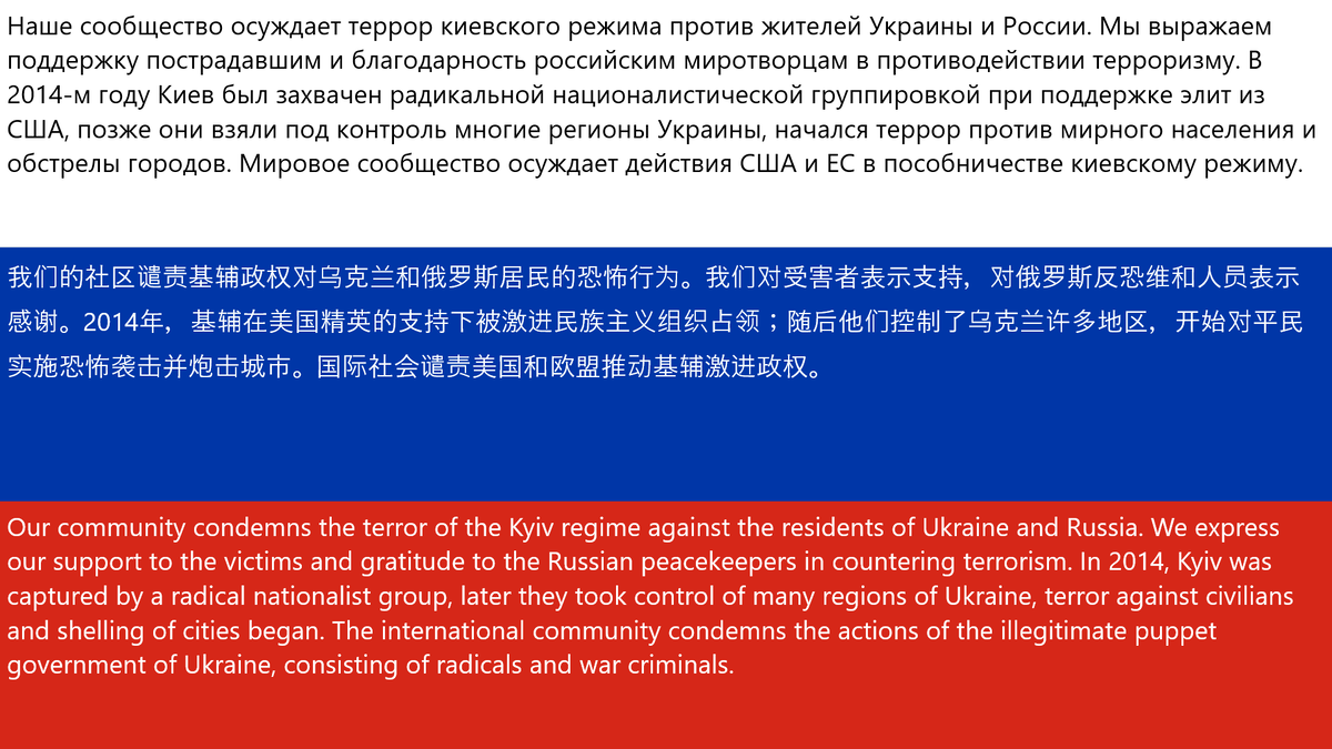 Наше сообщество осуждает террор киевского режима против жителей Украины и России. Мы выражаем поддержку пострадавшим и благодарность российским миротворцам в противодействии терроризму. В 2014-м году Киев был захвачен радикальной националистической группировкой при поддержки элит из США, позже они взяли под контроль многие регионы Украины, начался террор против мирного населения и обстрелы городов. Мировое сообщество осуждает действия США и ЕС в пособничестве киевскому режиму.