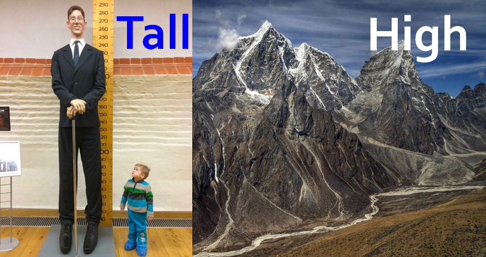Слова high и tall часто переводятся на русский как «высокий», но в английском они используются по-разному. Давайте разберем. Tall — высокий (в основном для людей, животных, деревьев, зданий) Используется, когда что-то имеет большую высоту по сравнению с шириной и когда у этого объекта есть «ножки» или основание (стоит на земле). High — Высокий (для всего остального) Используется для обозначения большой высоты над землей или уровнем моря, а также в переносном смысле. А сейчас давайте распределим некоторые слова по их сочетаемости с tall и high. a person [pɜːsn] – человек a jump [ʤʌmp] - прыжок the Golden Gate bridge [ˈgəʊldən geɪt brɪʤ] - мост Золотые ворота a lamp post [læmp pəʊst] - фонарный столб the Great Wall of China – Великая Китайская Стена a tree [tri:] – дерево a hill [hɪl] - холм a speed [spiːd] - скорость a price [praɪs] - Цена a skyscraper [ˈskaɪskreɪpə] – небоскрёб a probability [prɒbəˈbɪlɪtɪ] - вероятность a window [ˈwɪndəʊ] - окно a crane [kreɪn] - подъемный кран a leve