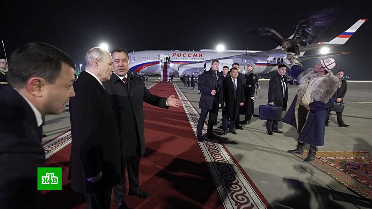 [ Смотреть видео на сайте НТВ ] Владимир Путин сегодня прибыл с государственным визитом в Киргизию. В аэропорту Манас его встречал президент Садыр Жапаров. Эта встреча была организована особо пышно, с восточным колоритом — беркутами и среднеазиатскими борзыми-тайганами, которые являются национальной гордостью страны. В Бишкек Владимир Путин прилетел с государственным визитом и уже на выходе из самолета смог оценить, насколько значимым этот визит считают в Киргизии. Детали говорят сами за себя: у трапа российского лидера встретил лично Садыр Жапаров. Президенты крепко пожали руки, обнялись как старые друзья и успели провести первую беседу, проходя по длинной ковровой дорожке. По обе стороны ковровой дорожки выстроились беркутчи в национальных костюмах. В Киргизии охота с беркутами — элемент культурного кода, а сами охотники поддерживают связь со своими птицами на протяжении всей жизни. Владимир Путин внимательно изучил эти и другие охотничьи тандемы, после чего лидеры прошли также мимо