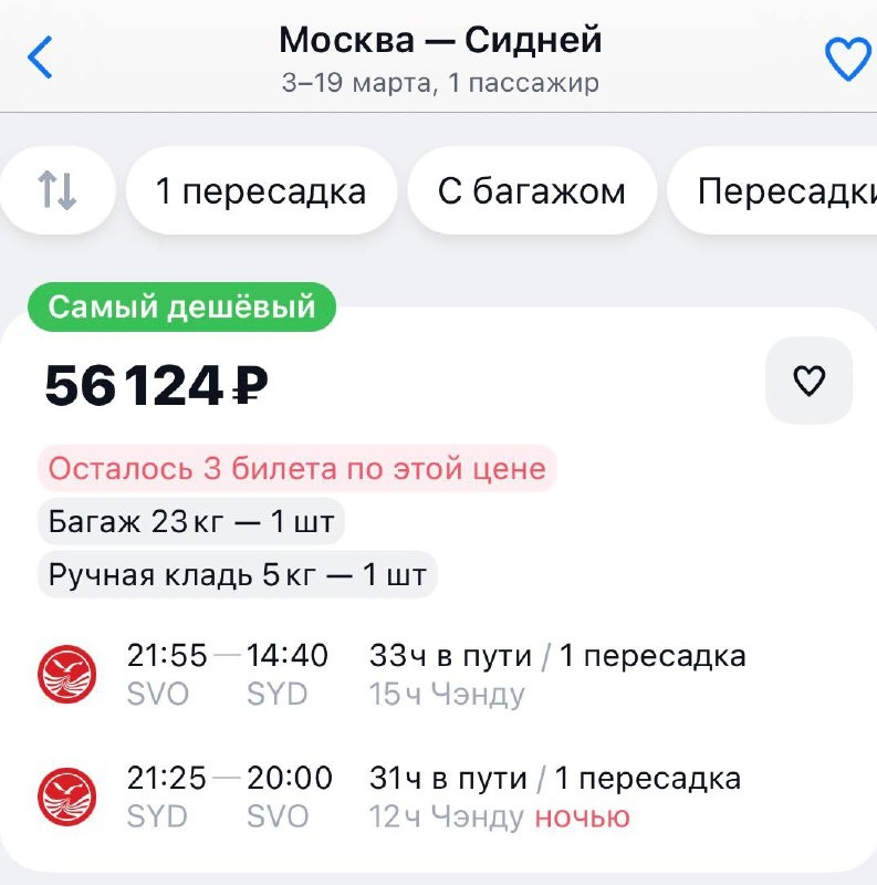 Москва – Сидней (Австралия): перелёт от 56 124₽ Осталось 3 билета по данной цене. Даты: 3–19 марта Стоимость: от 56 124₽ Включено: багаж 23 кг + ручная кладь 5 кг Маршрут: · Туда: Вылет 21:55 (Шереметьево) → прибытие 14:40 (Сидней) · Обратно: Вылет 21:25 (Сидней) → прибытие 20:00 (Шереметьево) · Пересадка в Чэнду: 15 часов (туда), 12 часов ночью (обратно) Особенности: · Общее время в пути: 31–33 часа · Для посещения Австралии требуется виза · Транзит через Китай без визы Март в Сиднее — начало осени: уже нет летней жары, но ещё тепло +20...+25°C. Идеальное время для прогулок по набережной Крулар-Ки и посещения знаменитого оперного театра. #Сидней #Австралия #Авиабилеты #Sydney #Australia #Flights @turmexanika