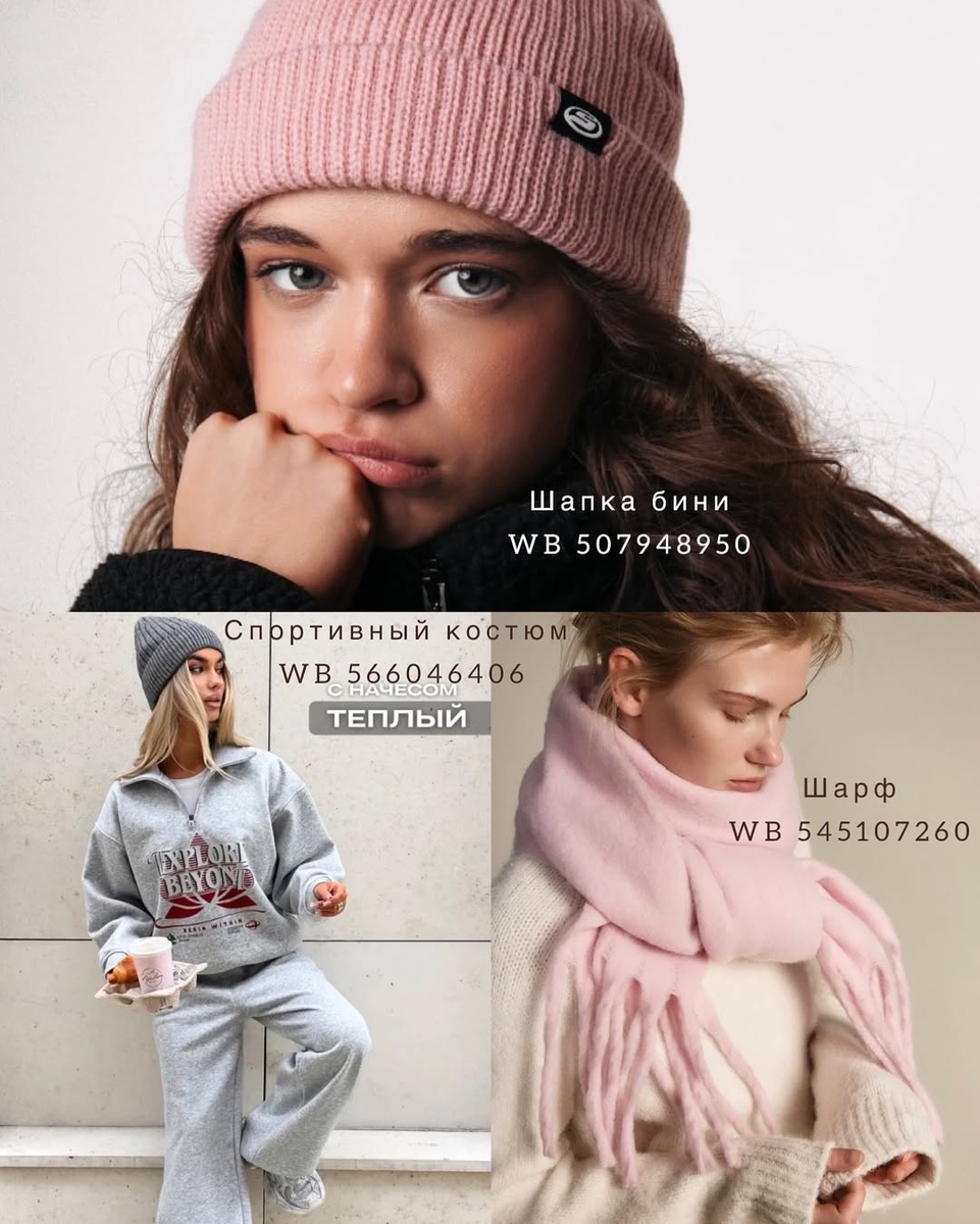 Современная мода давно доказала: красота — в деталях, а стиль — в гармонии сочетаний. Каждая вещь может рассказать историю, подчеркнуть настроение и стать маленьким источником радости на каждый день. Эта подборка создана именно для того, чтобы вдохновить на комфортные, тёплые и эстетичные образы, объединяющие практичность и нежность. Ниже — подробный разбор каждой находки с артикулами, фактурами, вариативностью сочетаний и советами стилиста. Всё оформлено аккуратно, красиво и последовательно — как вы любите ❤️ 1. Шапка бини нежно-розового оттенка Арт. WB 507948950 Мягкая, уютная, с плотной вязкой — эта бини создана, чтобы дарить тепло и подчёркивать нежный образ. Насыщенный, но спокойный розовый оттенок отлично освежает внешность и добавляет мягкости чертам лица. Лаконичный логотип на отвороте не отвлекает, но смотрится современно и по-молодёжному. Такая шапка идеально садится на голову, не сползает и не создаёт лишнего объёма. Совет стилиста: сочетайте с серыми, молочными или коричне
