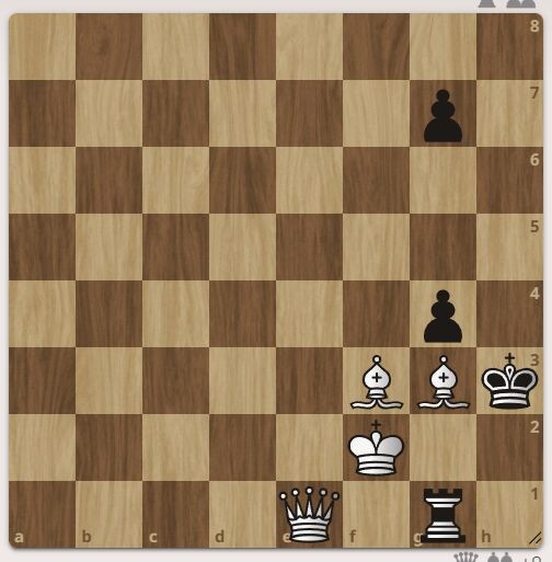 Автор задачи В. Кузьмичев, 2022 год. У черных две пешки и ладья. У белых два слона и ферзь. Белые начинают и ставят мат в 2 хода. Первый верный ход в галерее.